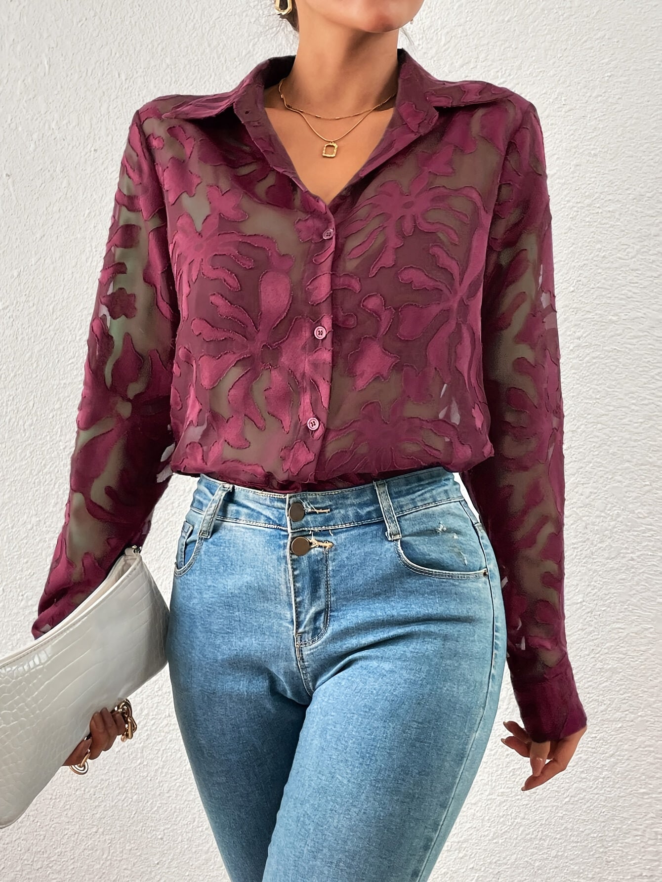 Chemise transparente femme à motifs veloutés col classique, fluide et élégante. Une pièce raffinée pour composer un look féminin, moderne et affirmé.